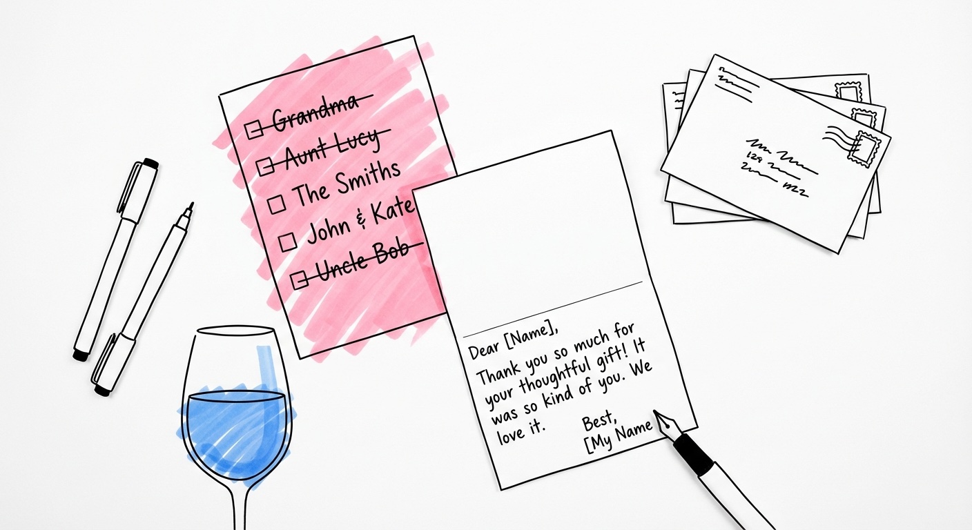 Börja med er gästlista — om ni använde ett digitalt verktyg som Lovio finns adresserna ofta redan sparade där. För gäster vars adresser ni saknar: fråga gemensamma vänner eller familjemedlemmar, eller skicka ett snabbt SMS och be om adressen. I värsta fall — skicka ett personligt digitalt tack istället. Det är bättre än inget tack alls.